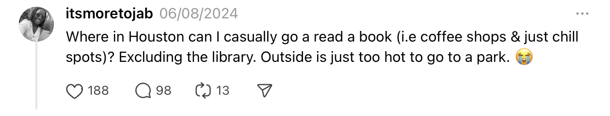 “Where in Houston can I casually go and read a book (i.e., coffee shops & just chill spots)? Excluding the library. Outside is just too hot to go to a park. 😭”