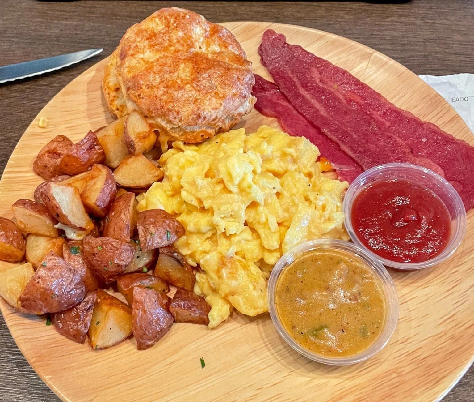 Classic Breakfast: Recommended; turkey bacon and biscuit substituted for pork bacon and toast.