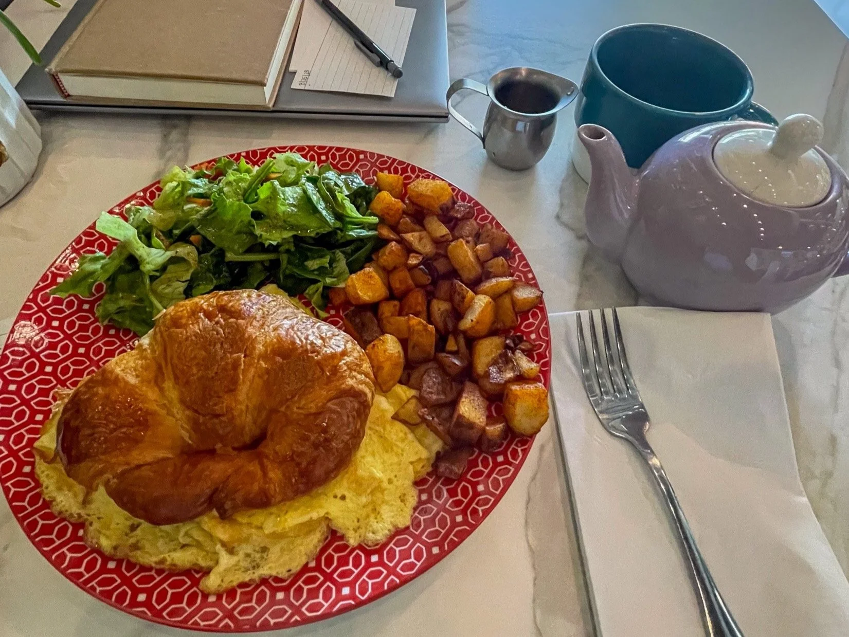 Food: Serves breakfast all day, including a breakfast croissant meal.